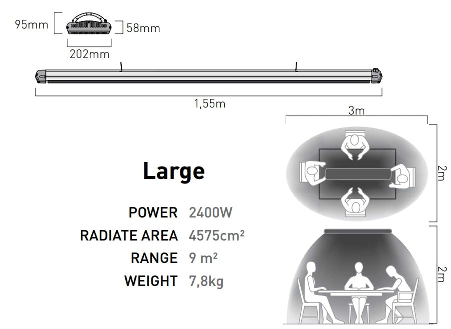 Adatto per il riscaldamento di ambienti domestici sia privati (appartamenti) che pubblici (ristoranti, pub). Gli apparecchi possono essere usati sia all’interno che all’esterno (patio, verande, balconi). L’apparecchio è dotato di elemento riscaldante a doppia resistenza.